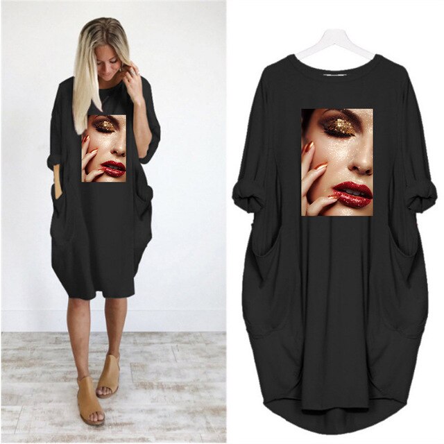 Fashion Women Dress Red Lips Sexy Beauty Print Women Full Sleeve O-neck Casual Loose Fall Thin Plus Size Female Midi Dresses