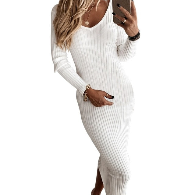 Mid-Calf Knitted Dress Sexy Long Sleeve Autumn Casual Stretchy Elastic Elegant O-Neck Women Solid Dresses Bodycon